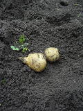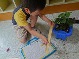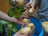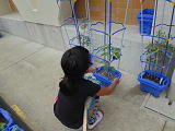 じゃがいもの成長を通して、水・養分・光・・・など、さまざまな学習を行ってます。6年生は実際のじゃがいものでき方を見て、土のにおいを感じたり、葉っぱの形や実のつき方に驚いたり、収穫に喜んだり・・・。自然界への興味・関心が次々にわいているようでした。