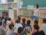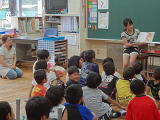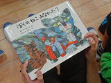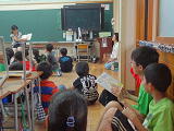 毎週木曜日、6年生は幼稚園・保育園に行き、園児を前に読み聞かせを行っています。園児たちは、おにいさん、おねえさんの登場に大喜び!目を輝かせて聴き入っていました。