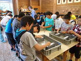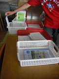 野菜集荷場を見学しました。野菜がきれいに箱に詰められていく過程を興味津々に見ていました。