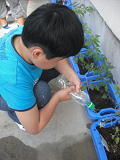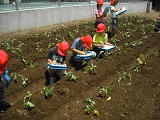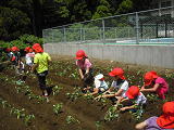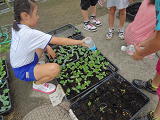 2年生は生活科でいもの苗植えをしました。一人2~3本ずつ植えていきました。その後、苗の長さ、葉の形、色、手触り、におい、葉や茎の大きさなどいろいろな方向から観察し、記録文に残す学習をしました。今、国語科では「かんさつ名人になろう」という学習をしています。また、算数科の「ながさ」の勉強もしています。国語、算数のお勉強を生かしながら学習しています。