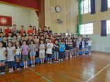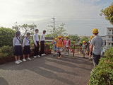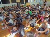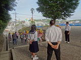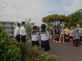 さわやかな「おはようございます」が響きました。小学生には大きく見える中学生・・・力強い声と堂々とした立ち姿に緊張しながらも、いっしょに活動できるのが嬉しそう・・・でした。あこがれの先輩たちとの活動は明日も続きます。