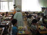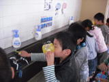 今日の給食はカレーライス・・・1年生も大喜び・・・6年生に配膳してもらいました。食べ終わったら「歯磨き体操」の時間。音楽にあわせて、一生懸命、歯磨き・・・。そして、口をすすいで完了・・・。
