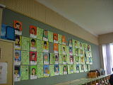 2年生の壁に掲示されている自画像です。思わず微笑みがこぼれる作品ばかりです。明日の参観日でじっくりごらんください。