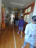 地区児童集会がありました。新1年生をお迎えにいって、地区ごとに登校班のメンバーが集まりました。登下校で危険な個所はないか・・・地震や津波が起こったらどうするのか・・・みんなで考えました。