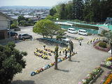 写真の右にみえている木々は八幡神社の森です。校歌3番「鎮守の森の鳥」たちが暮らしています。子供たちは、その声に「朝夕清くつつまれて勉強に励んで」います。
