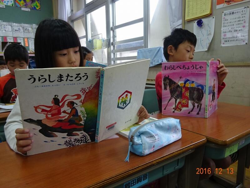 国語の単元「かさこじぞう」を学習した後、図書室にある昔話を読んでいます。