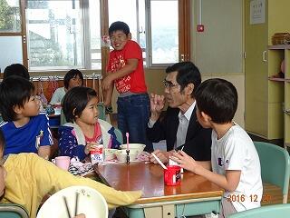 子ども達と一緒に給食を試食されました。優しい眼差しと口調で