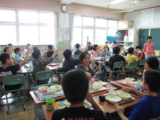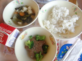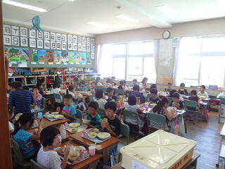 メインはラーメンとぎょうざ・・・。みんなたっぷりの量を美味しく頂きました。6年生はお誕生日のお友達を囲み、牛乳で乾杯してお祝いしていました。