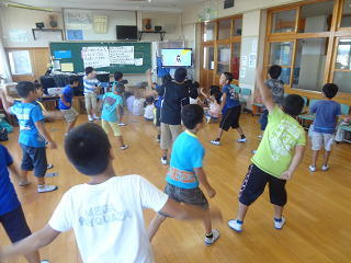 講堂でボールを使った活動を行っていました。それぞれの子供が汗をたくさんかいて、懸命に取り組んでいました。