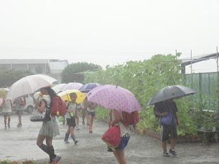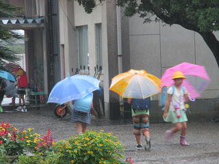 今日は大雨が予想されています。・・・朝は時折激しい雨・・・。子供たちは傘をもって元気に登校しましたよ。