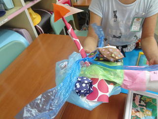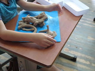 粘土を用いて楽しい作品を作っていましたよ。伸ばしたり・・・丸めたり・・・いろいろ工夫していました。