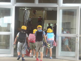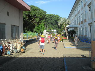 子供たちは汗だくですが元気に登校!お友達をみつけて駆け寄り、あいさつを交わしていました。笑顔がまぶしい爽やかな朝でもあります。