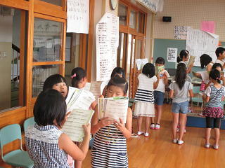 6年生は、毎週、幼稚園や保育園で読み聞かせを行っています。・・・そのための練習をそれぞれのグループごとに行っています。みんな積極的に取り込んでいます。