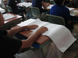 真っ白な和紙が配られ・・・八幡神社のお祭りのときに飾られる灯篭つくりが始まりました。どんな作品ができるのか・・・楽しみですね。