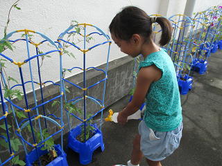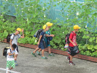 雲がたくさん広がっているものの青空がみえました。緑のカーテンの前を通る子供たち・・・・元気のよいあいさつが交わされていましたよ。