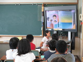 自分たちで電子黒板を用いて読み聞かせを行っていました。さまざまな工夫のある読み聞かせですね。