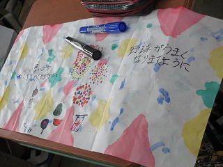 完成した作品が掲げられていました。子供たちは自分やお友達の作品をじっくりみていましたよ。
