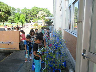 3年生が育てているひょうたんは、こんな風に育っています。子供たちは登校のたびに観察して、その成長を楽しみにしているようです。