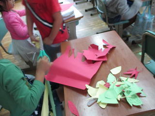自分たちでみつけた秋でエプロンを作っていました。保護者の方々は嬉しそうに見守られていましたよ。