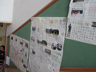 「班別研修で学んだこと」が一枚の模造紙にまとめられ、掲げてありますよ。読んでくれる人につたわるように写真を入れたり・・・レイアウトを考えたり・・。わかりやすい内容になっていますよ。