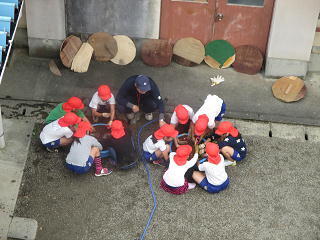 自分たちで育て、収穫したひょうたん・・・。きょうはマーブル色に染め、作品作り!楽しそうに取り組んでいましたよ。