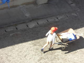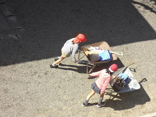 学年の畑を耕しに行きました。1輪車にいろいろなものをたくさん積んで、よろけながらも友達と励まし合って進んでいましたよ。頑張れ!3年生!