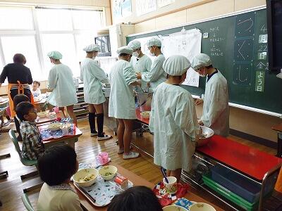 6年生が1年生の給食のお世話をしています。ありがとう。