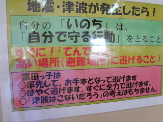 連日続く地震・・・・。それぞれのクラスで地震や津波の防災について様々な取り組みがなされています。特に入学したばかりの1年生は避難場所の確認を丁寧に行っていました。来月は中学生や地域の方々も参加しての避難訓練が計画されています。