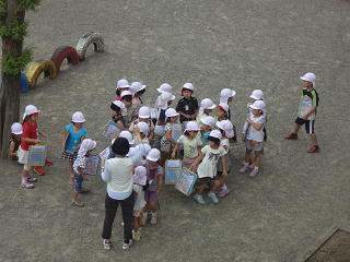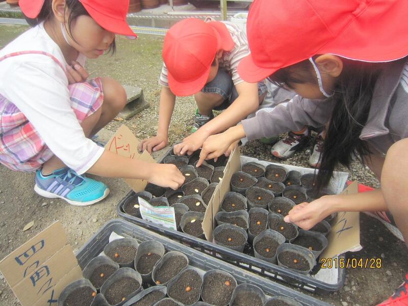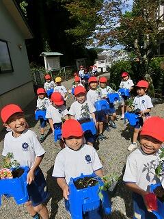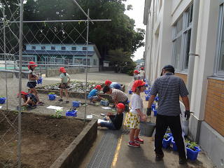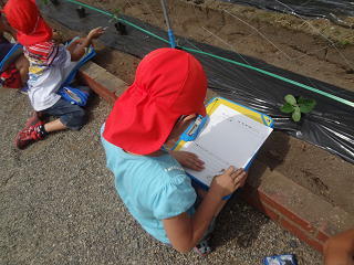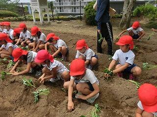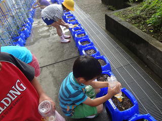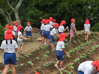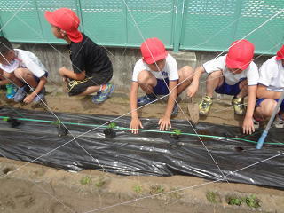 プール南側の畑に、さつまいもの苗を植えました。一人2本の苗をもらって、赤ちゃんを寝かせるようにやさしく植えていきました。秋のおいもほりと、おいも料理づくりに今からわくわくです。