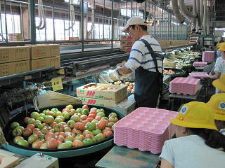 トマトの選別作業中です。くるくる回るおぼんの上でトマトが踊っています。