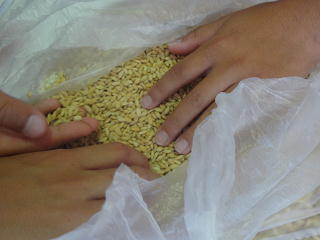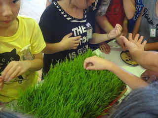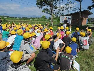 「お米との出会い」の学習・・・今日は苗を触ったり・・・、もみ殻を手に乗せてみたり、・・食べてみたり・・・。ワクワクする学習が講堂で展開されました。