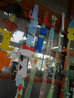 自分たちで切り抜いたいろんな型が飾られています。華やかです。