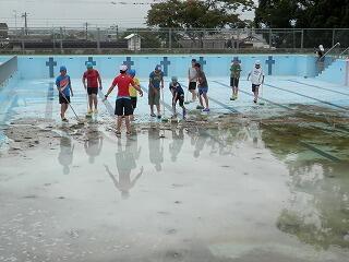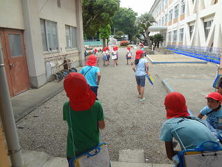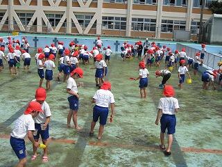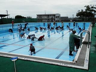 6年1組と2組が5校時に、6年3組が6校時にプール開きにむけて、プール清掃を行いました。1年間かけてたまった葉っぱやどろが、6年生のおかげできれいになりました。さすが、6年生ですね。これで、全校のみんなも、気持ちよく水泳の学習ができるでしょう。6年生、ありがとう。