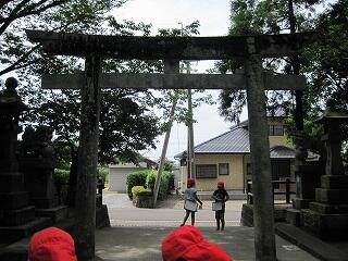社会科の学習で学校の周りを探検に行きました。八幡神社で鳥居を発見。神社の地図記号だ!