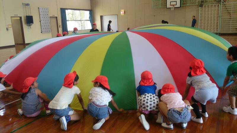 ウォークラリーをして支援学校を探検したり、みんなで力を合わせてバルーンを膨らませて遊んだりしました。支援学校のお友達と一緒に遊ぶことができて、とても楽しかったようです。