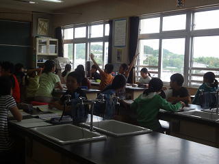 理科室での授業!自分たちの教室と違って、たくさんの実験道具に囲まれての学習・・。意欲的に取り組んでいましたよ。