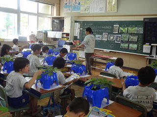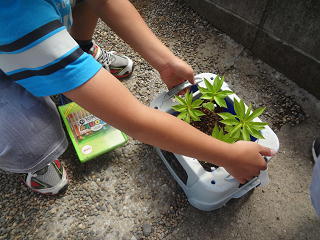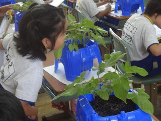 自分たちで育てた苗・・・ポットから広い学年の畑に植えかえました。みんな楽しそうに記録したり、お世話をしたりしていました。