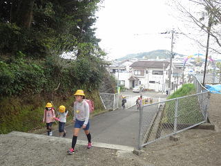 登校班のおにいさん、おねえさんがやさしく、いっしょに歩いてくれています。安心ですね。