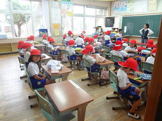 先生から一つ一つ学んでいます。荷物の置き場所・・・ランドセルの置き場所等・・・、子供たちは懸命に学んでいますよ。