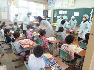 当番の子供たちは配ぜんの準備・・・・。当番でない子供たちは、マイコップに水をくみ、給食後の歯磨きに備えます。どの学年もてきぱきと行っていましたよ。