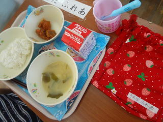 お気に入りのランチマットを敷いて、6年生の配膳してくれた給食を美味しそうにいただいてましたよ。