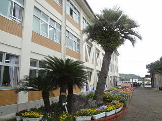 正門玄関前はお花でいっぱいです。