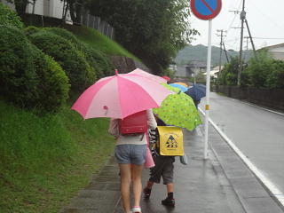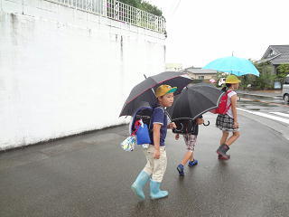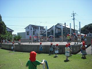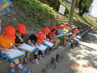 梅雨の晴れ間、生活科の学習で学校の周りを探検しました。