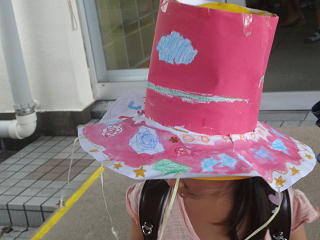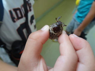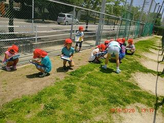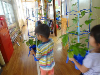 自分で育てている朝顔の観察を楽しそうに行っていました。カマキリをみつけた子供は、大はしゃぎ・・・・。
