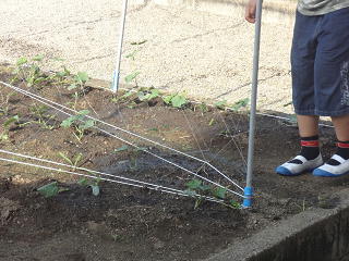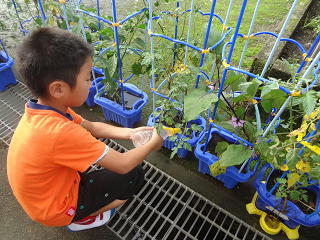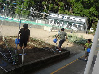 学年の畑に植えたひょうたん等に水をたっぷりあげていました。そして、植物の成長を嬉しそうに眺めていましたよ。