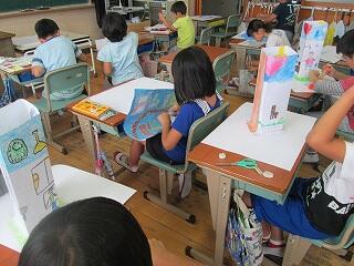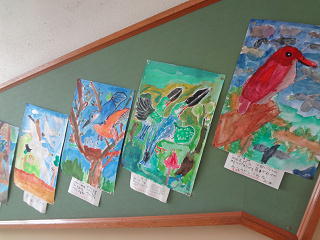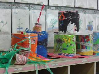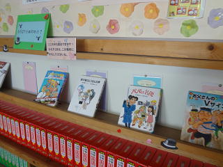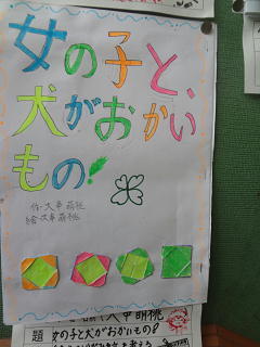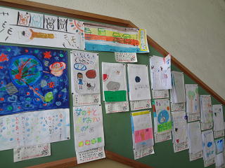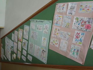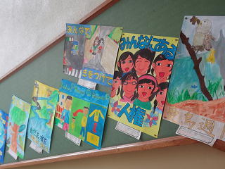 4年生が考えた絵本やお話が掲げられています。夢や希望あふれる作品の数々です。