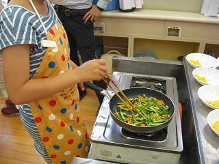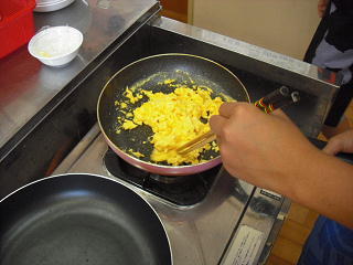 みんなで協力して、スクランブルエッグと野菜いため(ピーマン、にんじん、キャベツ)を作りました。