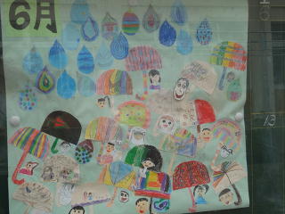 2年生の制作した楽しい傘や雨で彩られていますよ。