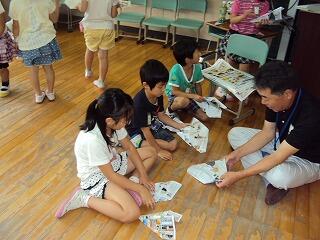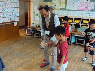 けん玉、紙でっぽう、ぱっちんガエルなど。地域の老人クラブの方々をお招きして、遊び方のコツをたくさん教えていただきました。