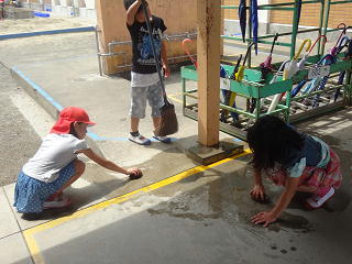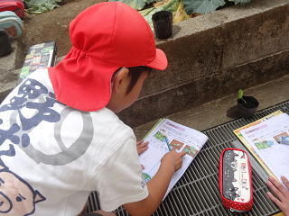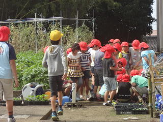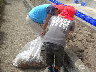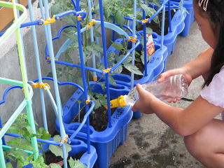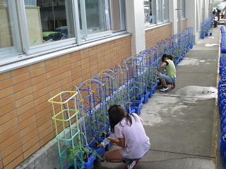 自分たちが育てている野菜に水やり・・・。日々の成長を嬉しそうに感じているようでした。